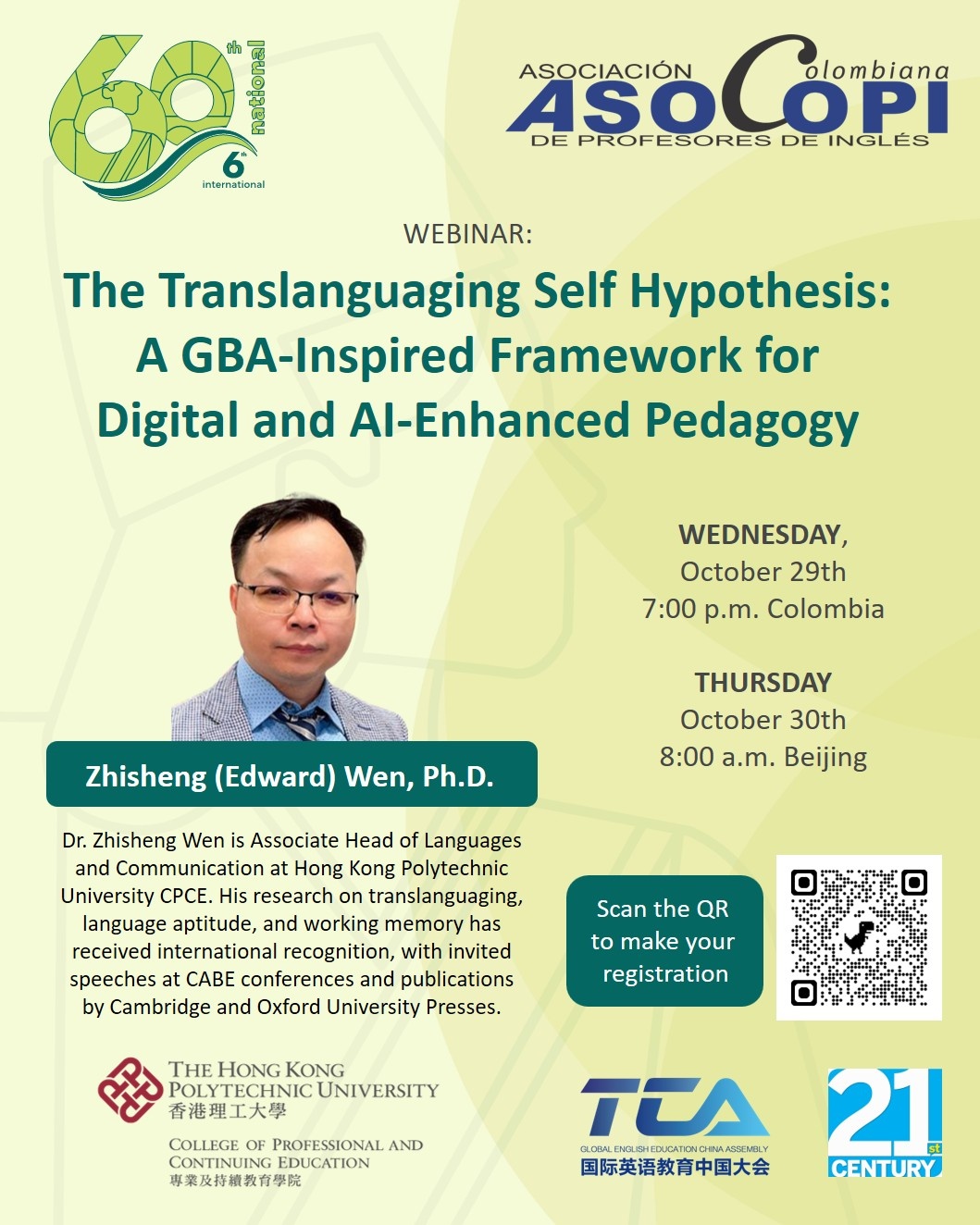 In this webinar, Dr. Zhisheng (Edward) Wen will introduce the Translanguaging Self Hypothesis, a GBA-inspired framework that bridges translanguaging, digital tools, and AI to enhance language learning and teaching. Drawing on his extensive international research and experience, Dr. Wen will invite us to rethink the role of technology and multilingualism in shaping the future of language education.